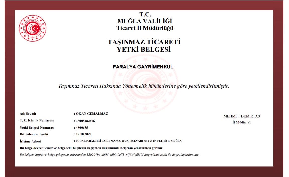“Yurt dışında aldığım eğitim ve tecrübelerimi ülkemde değerlendirmek için bundan sonra yaşayacağım yer olan Fethiye’ye yerleşerek, Mesleki yeterlilik ve taşınmaz ticareti belgelerini alarak, Faralya Gayrimenkul Yatırım Danışmalık firmasını kurdum.” – Okan Gemalmaz